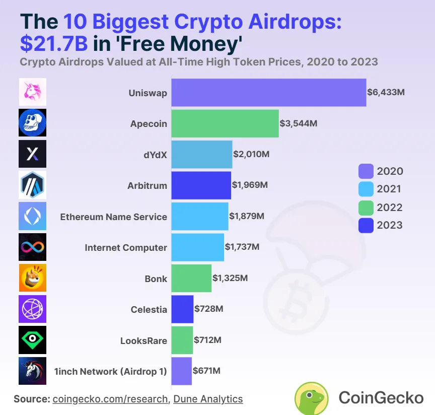 По объему средств в долларовом эквиваленте аирдроп Lighter обошел 1inch ($671 млн) и занял десятое место в общем рейтинге. Абсолютным лидером остается Uniswap, распределивший в 2020 году токены на $6,43 млрд.