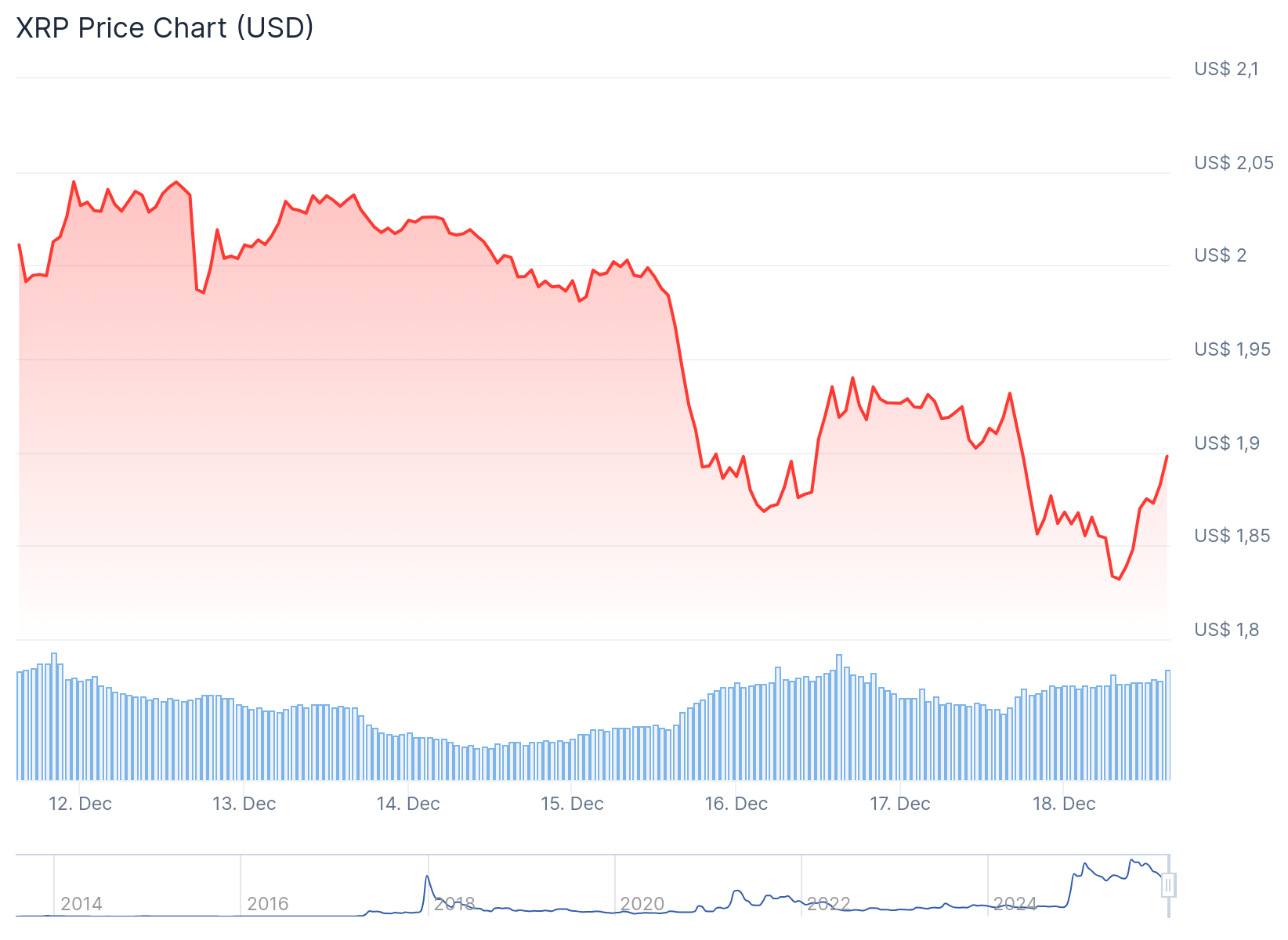 Zum Zeitpunkt des Schreibens notiert der XRP-Kurs bei etwa 1,90 Dollar, nach einem Wochenrückgang von 6,8 Prozent. Damit liegt der Kurs deutlich unter dem Allzeithoch vom Juli, das bei 3,65 Dollar erreicht wurde.
