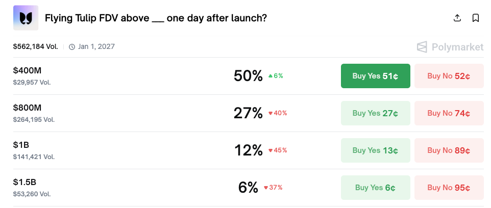 Flying Tulip confirmed the sale date on Saturday, and prediction markets are giving the platform a 50-50 chance of trading above a $400 million fully diluted valuation (FDV), albeit on low volumes.