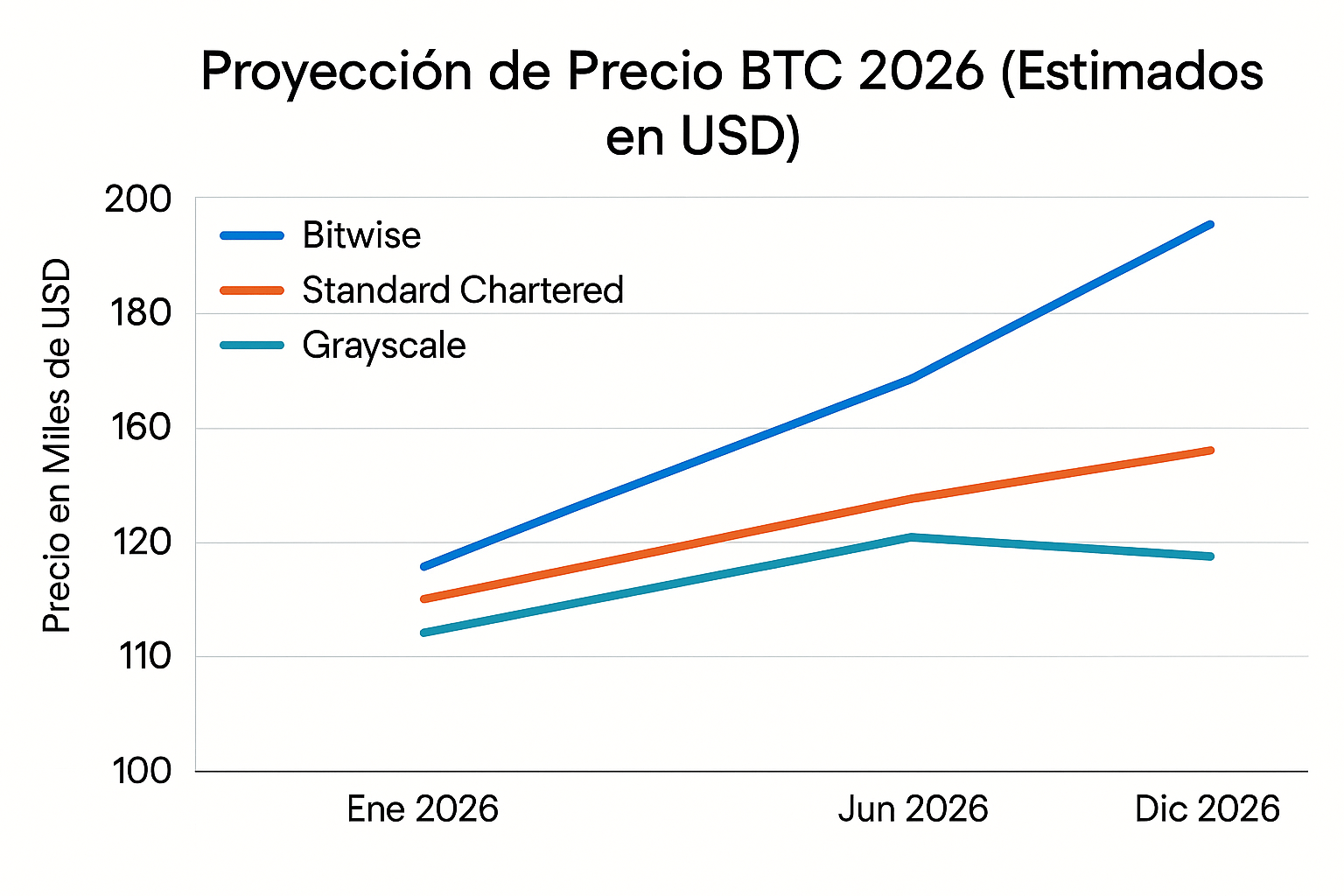 • Pronósticos: Standard Chartered $150K (bajado de $300K); Bitwise $200K superando pico 2025; Grayscale predice era institucional.