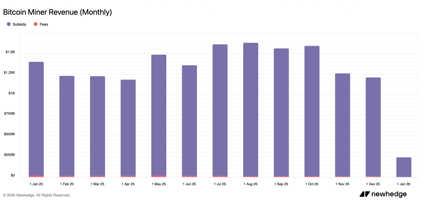 - What are miners relying on to improve profitability in early 2026?Miners remain largely dependent on BTC price gains, with onchain fees still contributing less than 1% of block rewards.
