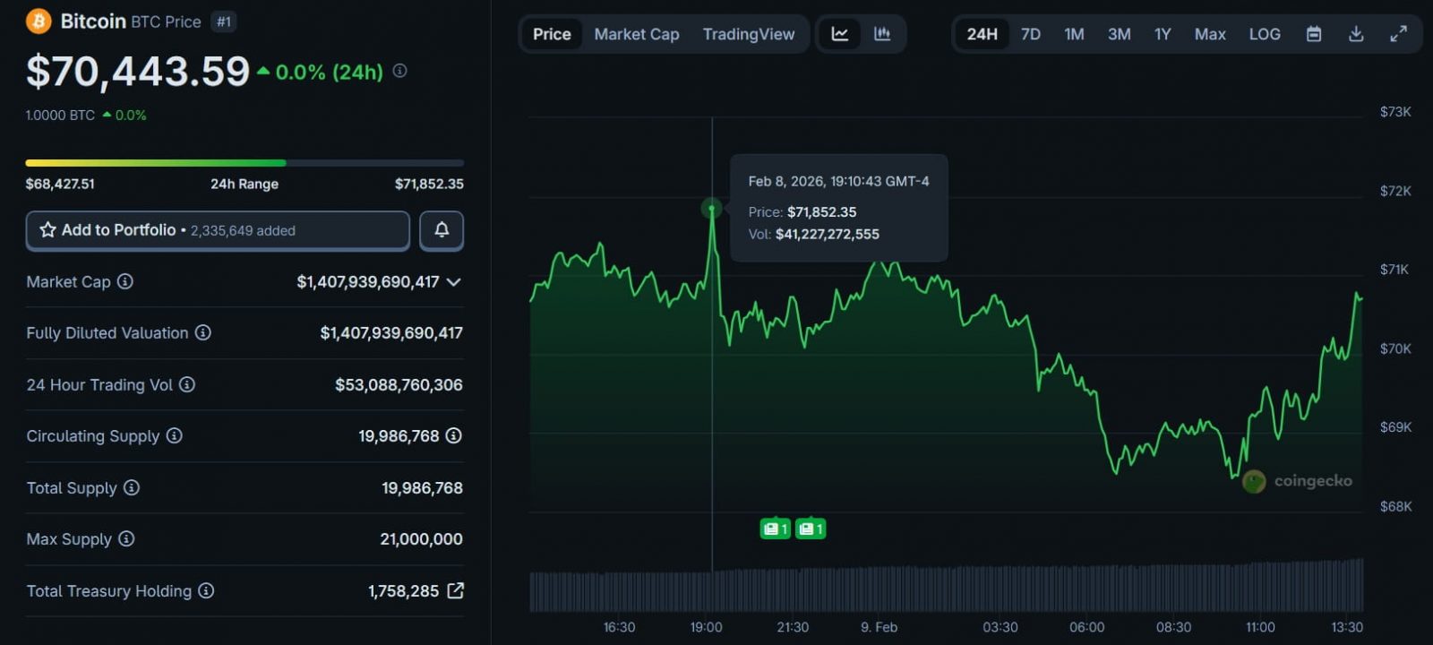 Gráfico de precio de $BTC en las últimas 24 horas el 9 de febrero de 2026. Fuente: CoinGecko