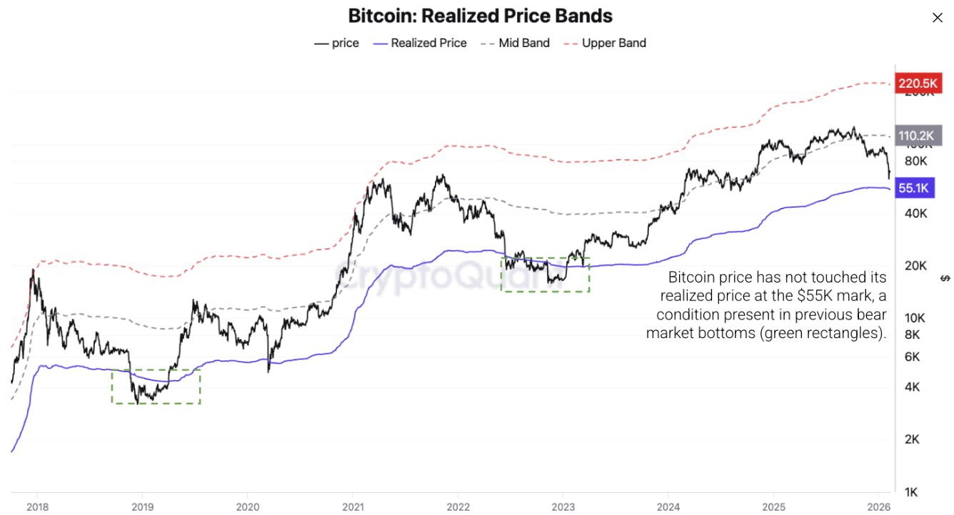 Las bandas de precio realizado de Bitcoin, que históricamente han sido áreas de soporte importantes en mercados bajistas anteriores, se muestran a continuación. Actualmente, el precio de Bitcoin se sitúa un 18% por encima de esta marca. En los dos mercados bajistas anteriores, el precio cruzó por debajo de ella en un 24% (noviembre de 2022, tras el colapso de FTX) y un 30% (diciembre de 2018). Además, una vez que el precio alcanza este nivel, tiende a estabilizarse durante 4-6 meses.