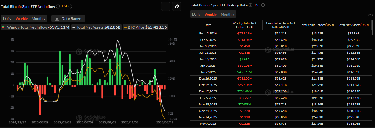 La demanda institucional por Bitcoin continúa debilitándose. Según los datos de SoSoValue, las salidas de los ETF de Bitcoin al contado se mantuvieron robustas hasta el jueves, totalizando 375,11 millones de dólares. Estos retiros apuntan a una cuarta salida semanal consecutiva, sin lograr apoyar los precios de $BTC. Si esta tendencia continúa, $BTC podría ver una corrección adicional en las próximas semanas.