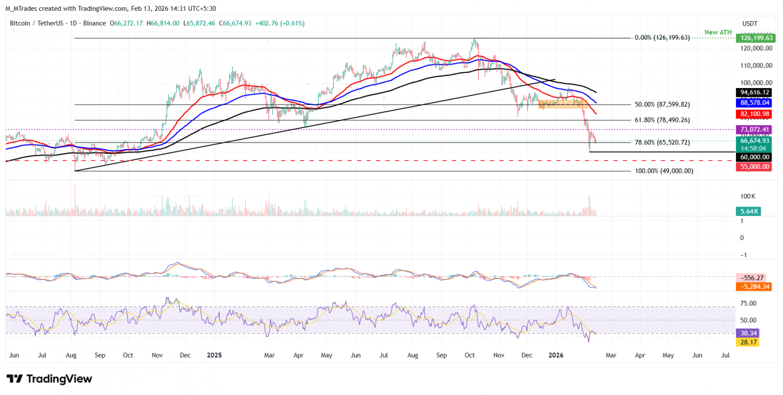 Si el $BTC rompe y cierra por debajo de 65.520$, podría extender la caída hacia el mínimo del 6 de febrero en 60.000$.