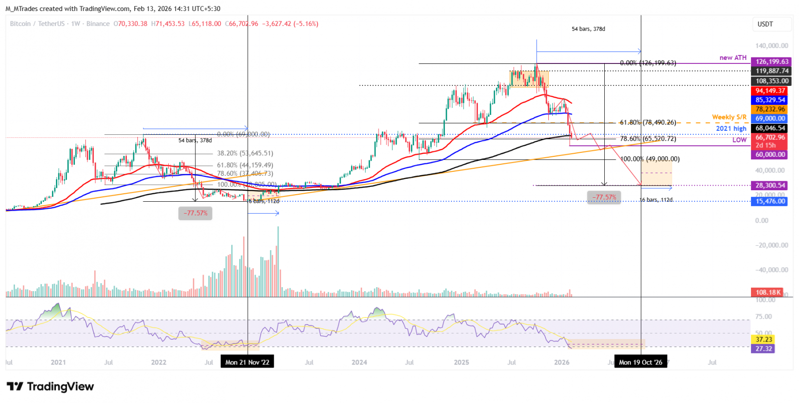 En el período 2025-2026, el $BTC alcanzó un nuevo $ATH de 126.199$ en octubre de 2025 y desde entonces ha corregido un 46% hasta la segunda semana de febrero, al momento de escribir el viernes, cayendo por debajo de la media móvil exponencial de 200 semanas en 68.046$.