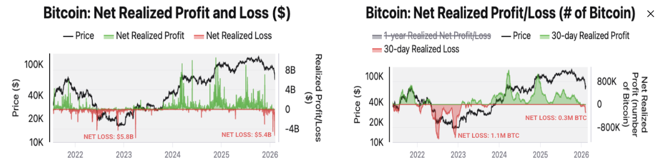 El gráfico a continuación muestra que los tenedores de Bitcoin han realizado las mayores pérdidas diarias desde el 30 de marzo de 2023, y que estas pérdidas son mayores que las que siguieron al colapso del intercambio FTX. Las pérdidas netas realizadas fueron de 5.4 mil millones de dólares el 5 de febrero, cuando el $BTC cayó de un máximo de 73.341$ a 62.909$, una caída del 14% en un solo día. Estas pérdidas fueron las más grandes desde marzo de 2023, cuando ascendieron a 5.8 mil millones de dólares, y mayores que las pérdidas de 4.3 mil millones de dólares registradas unos días después del colapso de FTX en noviembre de 2022.