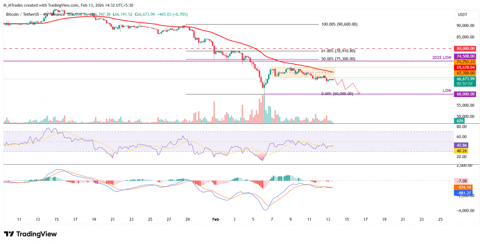 Si el $BTC enfrenta rechazo desde el límite inferior de consolidación en 67.300$, podría extender la corrección para volver a visitar el mínimo del 6 de febrero en 60.000$.