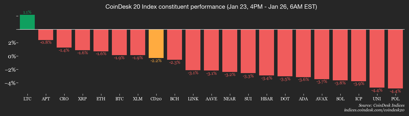 Bitcoin cayó un 0.8% en 24 horas para situarse por debajo de los $88,000, y ether perdió más del 1.6% hasta poco menos de $2,900. El índice más amplio CoinDesk 20 (CD20) el índice retrocedió 1.54%.