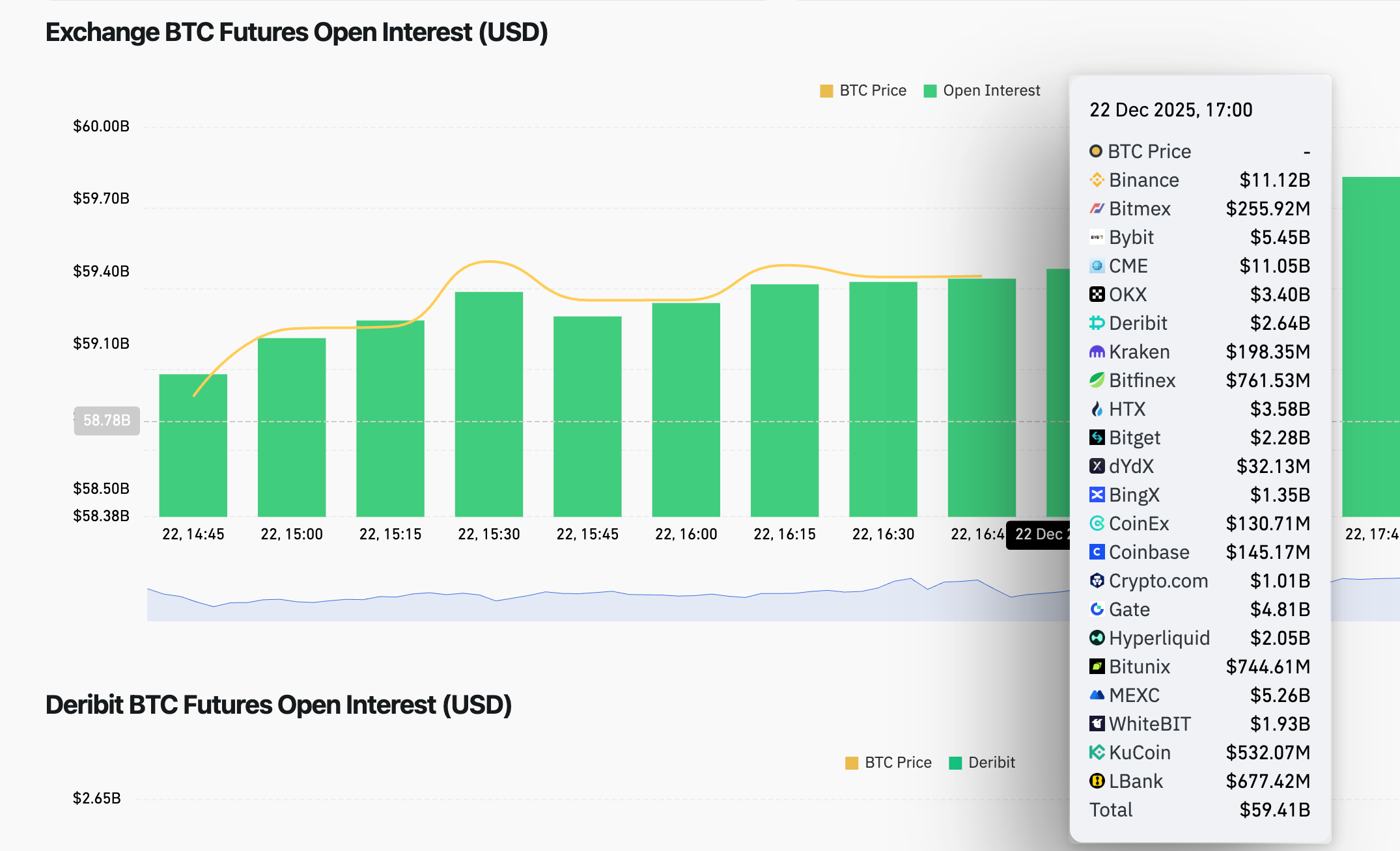 Derivatives positioning shows risk building alongside the price. Bitcoin futures open interest rose steadily as BTC pushed higher on Monday, climbing toward $60 billion across major venues, according to CoinGlass data.