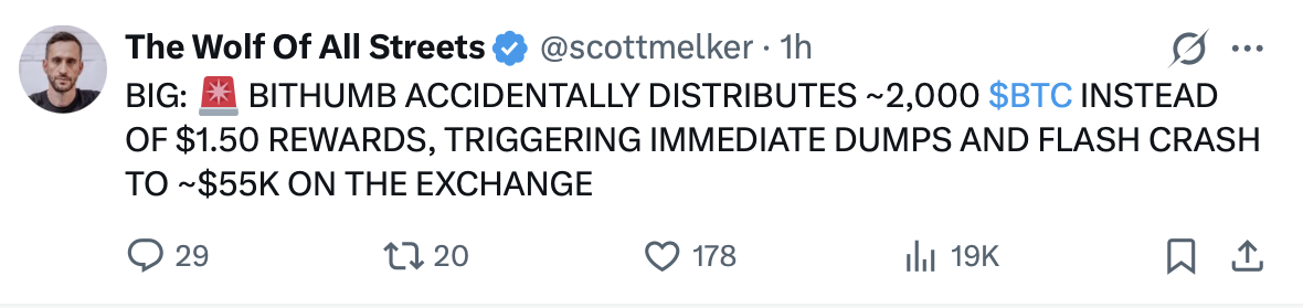 Aunque Bithumb no reveló la cantidad involucrada, varios usuarios en X afirmaron que algunas cuentas fueron acreditadas erróneamente con aproximadamente 2.000 Bitcoin (BTC), una afirmación que no ha sido verificada de forma independiente.