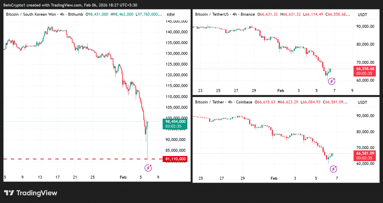 $BTC/KRW im Vergleich zu $BTC/$USDT auf Binance und Coinbase. Quelle: TradingView”>