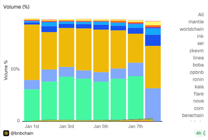 El ecosistema en cadena Binance transporta hasta el 40% del tráfico total a principios de 2026. El aumento de la demanda fue uno de los principales impulsores de las actualizaciones de la red.