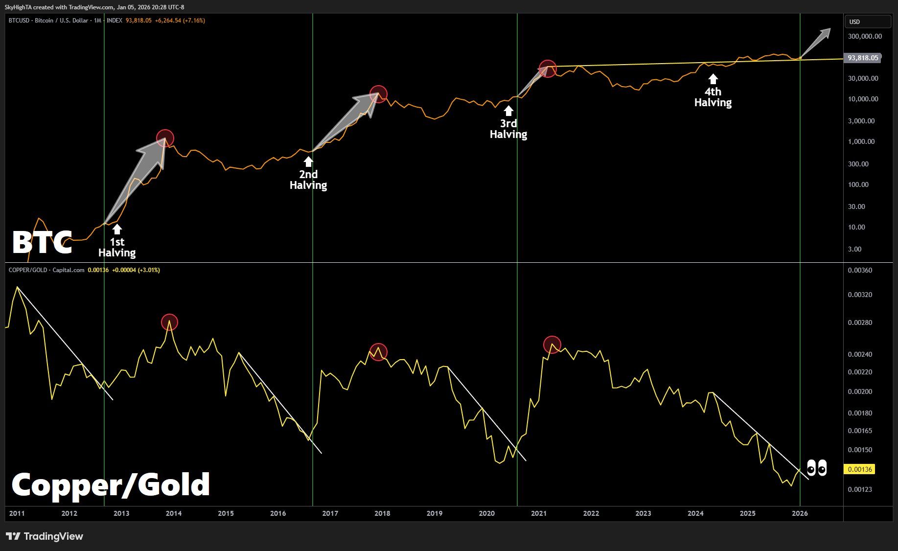 Durante la cuarta reducción a la mitad de bitcoin, en abril de 2024, la proporción cobre-oro seguía cayendo. Desde entonces, esa dinámica ha cambiado. La proporción ahora se sitúa cerca de 0.00136 después de tocar fondo en octubre alrededor de 0.00116.