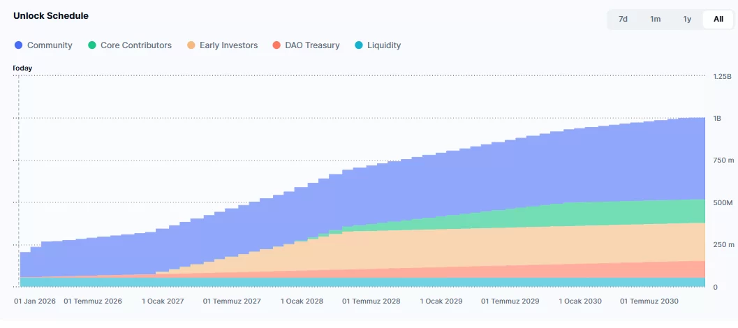 Actualmente, la capitalización de mercado es de $26 millones con una valoración completamente diluida (FDV) de $130 millones. No se espera que los eventos de desbloqueo de tokens ocurran rápidamente. El 19 de enero, el 3.17% del suministro—equivalente a 31.69 millones de tokens—se liberará en circulación. Otro desbloqueo del mismo porcentaje ocurrirá el 19 de febrero. No habrá más desbloqueos hasta el 19 de diciembre, lo que sugiere que la inflación no será excesivamente alta, lo que podría ofrecer cierto optimismo. Sin embargo, a partir de 2027, habrá un desbloqueo mensual del 2% de tokens, lo que llevará a una tasa de inflación del 8.34% en el primer año y del 24% en el segundo año.
