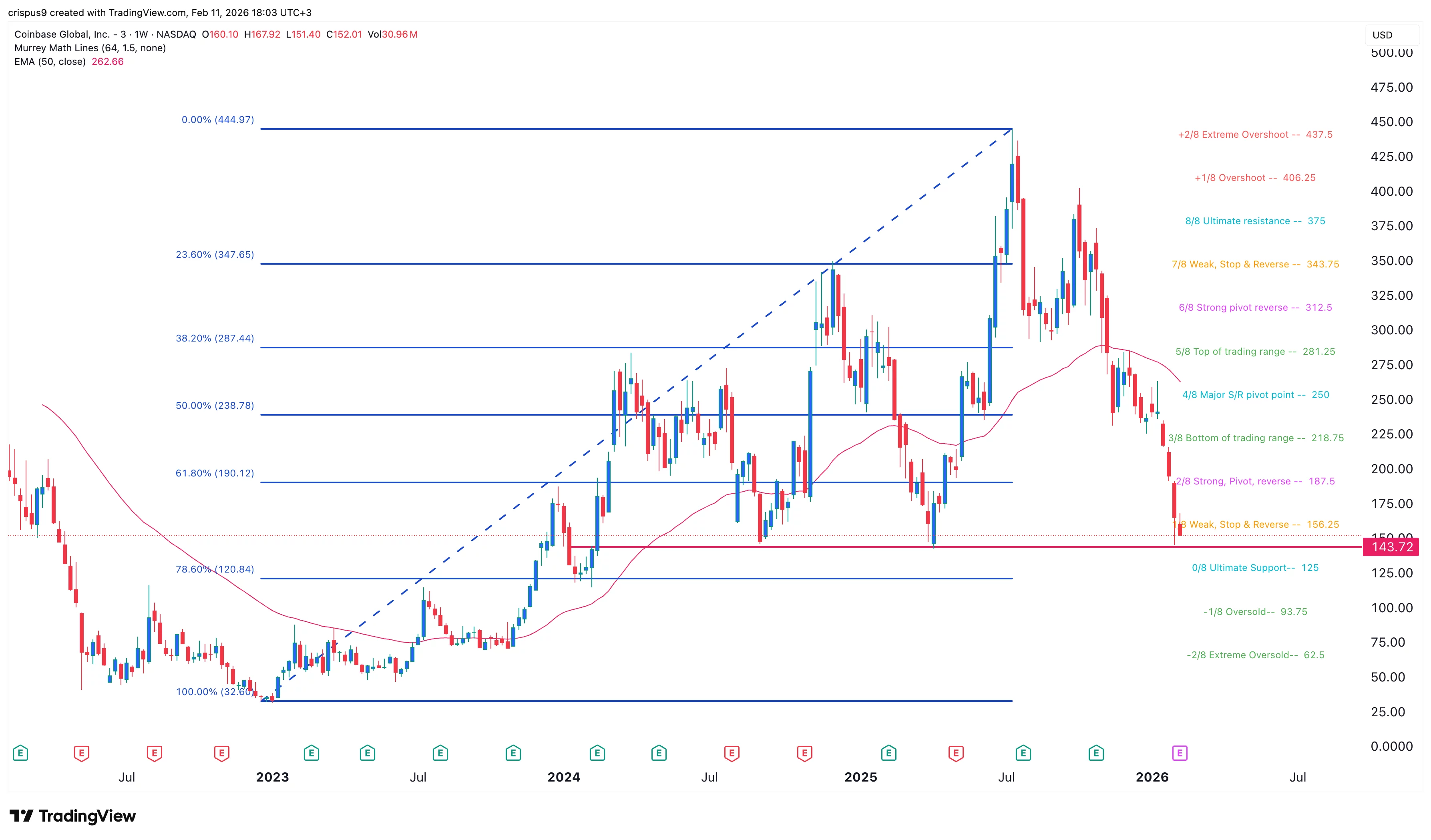 The weekly timeframe chart shows that the COIN stock price has crashed in the past few months, dropping from the all-time high of $445 in July 2025 to the current $153.