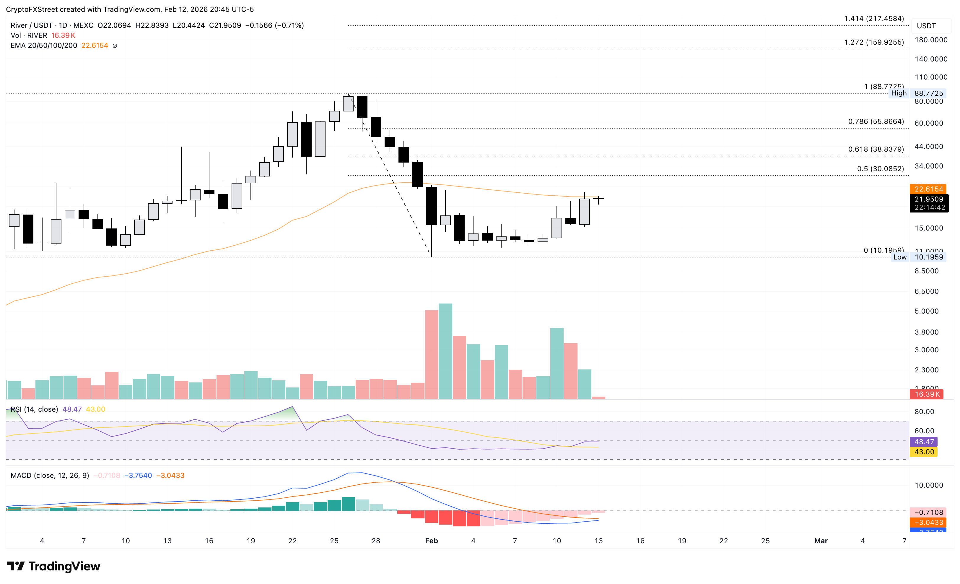 River se está negociando cerca de 21.50$ en el momento de la publicación el viernes, con resistencia en la media móvil exponencial (EMA) de 50 días en 22.59$ tras el repunte del 40% del jueves. La recuperación en forma de U en $RIVER registra más del 70% de ganancias hasta ahora esta semana.