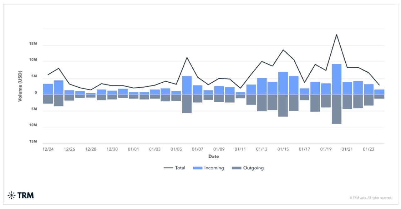 Newly established XinbiPay Wallet service’s hot wallet inflow and outflow since Dec. 24, 2025. Source: TRM Labs