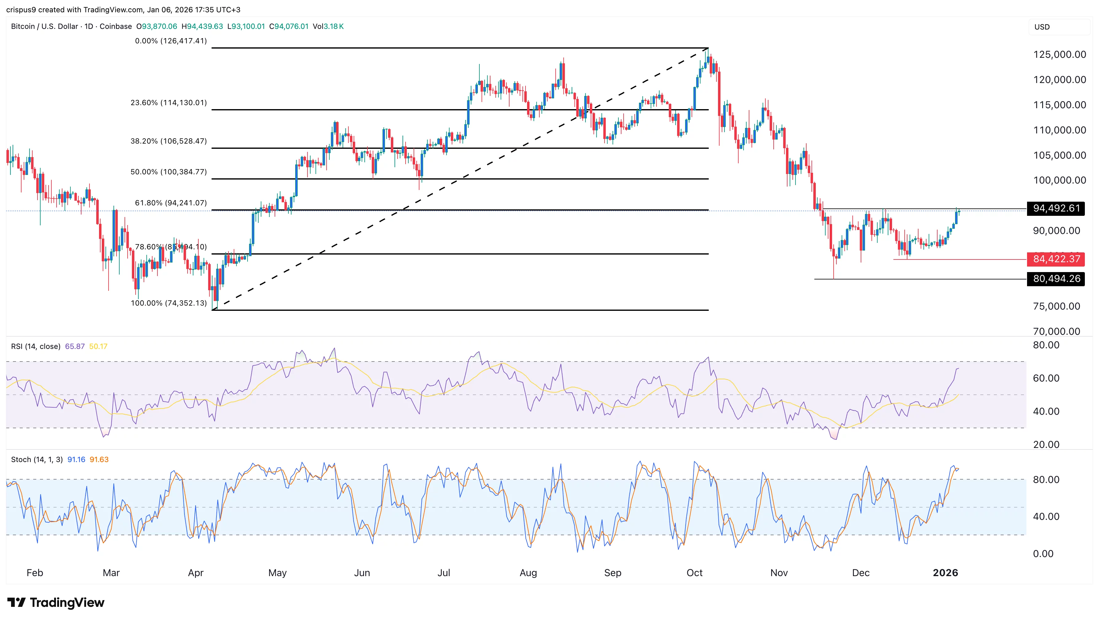 A closer look shows that technicals also explain why the crypto rally is accelerating. The daily chart shows that the Bitcoin price moved from a low of $80,494 in November to the current $94,100.