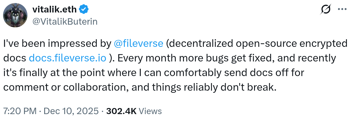 For documents, Fried recommends Fileverse: a decentralized, privacy-first end-to-end-encrypted alternative to Google Workspace and Notion that lets you collaborate on documents, spreadsheets and files onchain using decentralized storage and wallet-based access control. It was also recently praised by Ethereum co-founder Vitalik Buterin.
