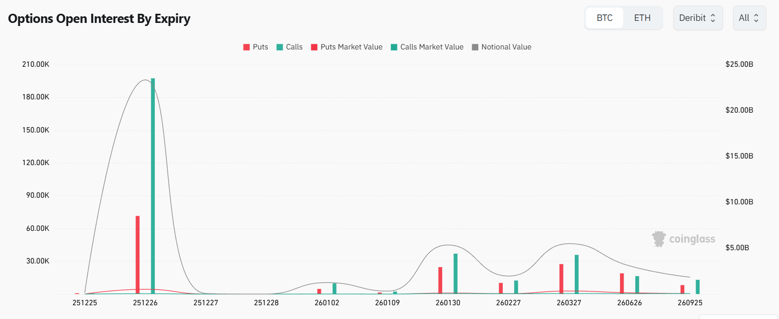 26 декабря 2025 года на рынке ожидается важное событие — истекает огромный объем опционов примерно на $300 млн. Контракты формируют так называемую гамма-нагрузку (гамма — показатель в опционах, из-за которого дилеры вынуждены активно хеджироваться и тем самым удерживают цену в диапазоне). Примерно 58,2% всей этой гамма-структуры исчезнут в один день. После этого большая часть искусственных ограничений пропадет, и рынок сможет двигаться свободнее.