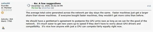 Вместе с тем, ради поддержания сети, Сатоши-Патоши, вероятно использовал особый клиент, который отличался многопоточностью — в отличие от первых версий программного обеспечения. Это не кажется чем-то удивительным на фоне обсуждений «продвинутого GPU-майнинга» на раннем биткоин-форуме Bitcointalk. Иначе говоря, аноним представлял себе возможные сценарии «продвинутой добычи» изначально. Еще в 2009 году Сатоши призывал других «отложить гонку вооружений GPU» на как можно более поздний срок ради всеобщего блага, чтобы сеть росла устойчиво, а новые пользователи охотно знакомились с технологией, и у всех была возможность заработать.