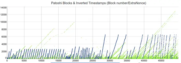 Оригинальная графическая визуализация Лернера за период с момента запуска сети до января 2010 года позволяет идентифицировать схожие наклонные линии ExtraNonce: