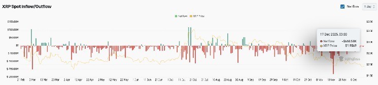Важно, что последние данные показывают резкий отрицательный чистый поток ближе к концу декабря. Чистые оттоки достигли примерно $660,000, при этом XRP торговался около $1.91. Эта активность указывает на распределение, а не на накопление на текущих уровнях. Кроме того, данные свидетельствуют о снижении убеждённости среди покупателей-спотовых покупателей.