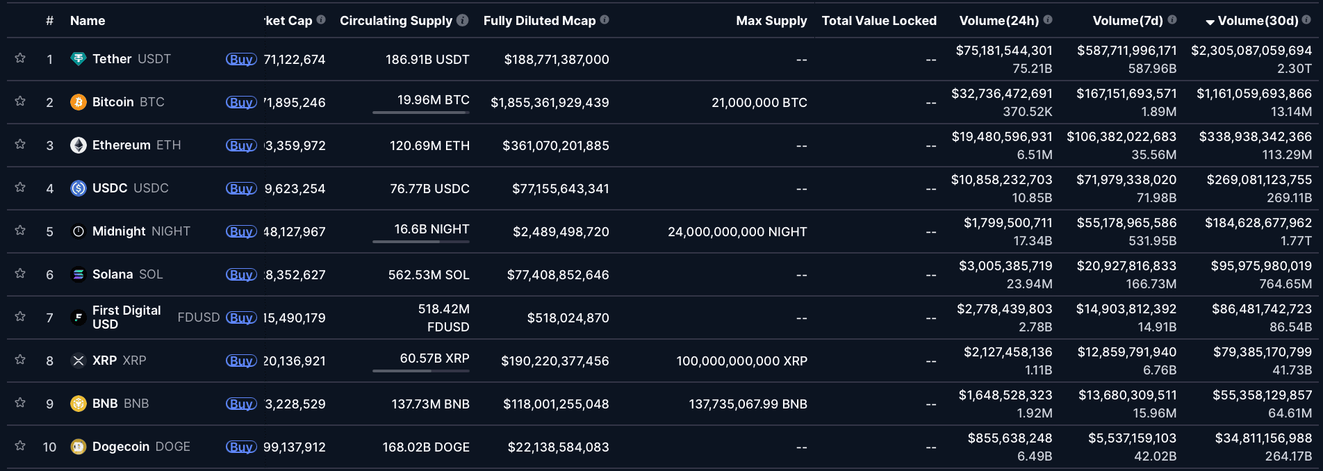 Gemessen am 30-Tage-Tradingvolumen kommt Midnight aktuell auf rund 184 Milliarden US-Dollar. Damit liegt das Projekt laut öffentlich einsehbaren Marktdaten nur hinter Bitcoin, Ethereum sowie den beiden Stablecoins USDT und USDC. Direkt dahinter folgt bereits Midnight – noch vor Solana, XRP, BNB oder Dogecoin.