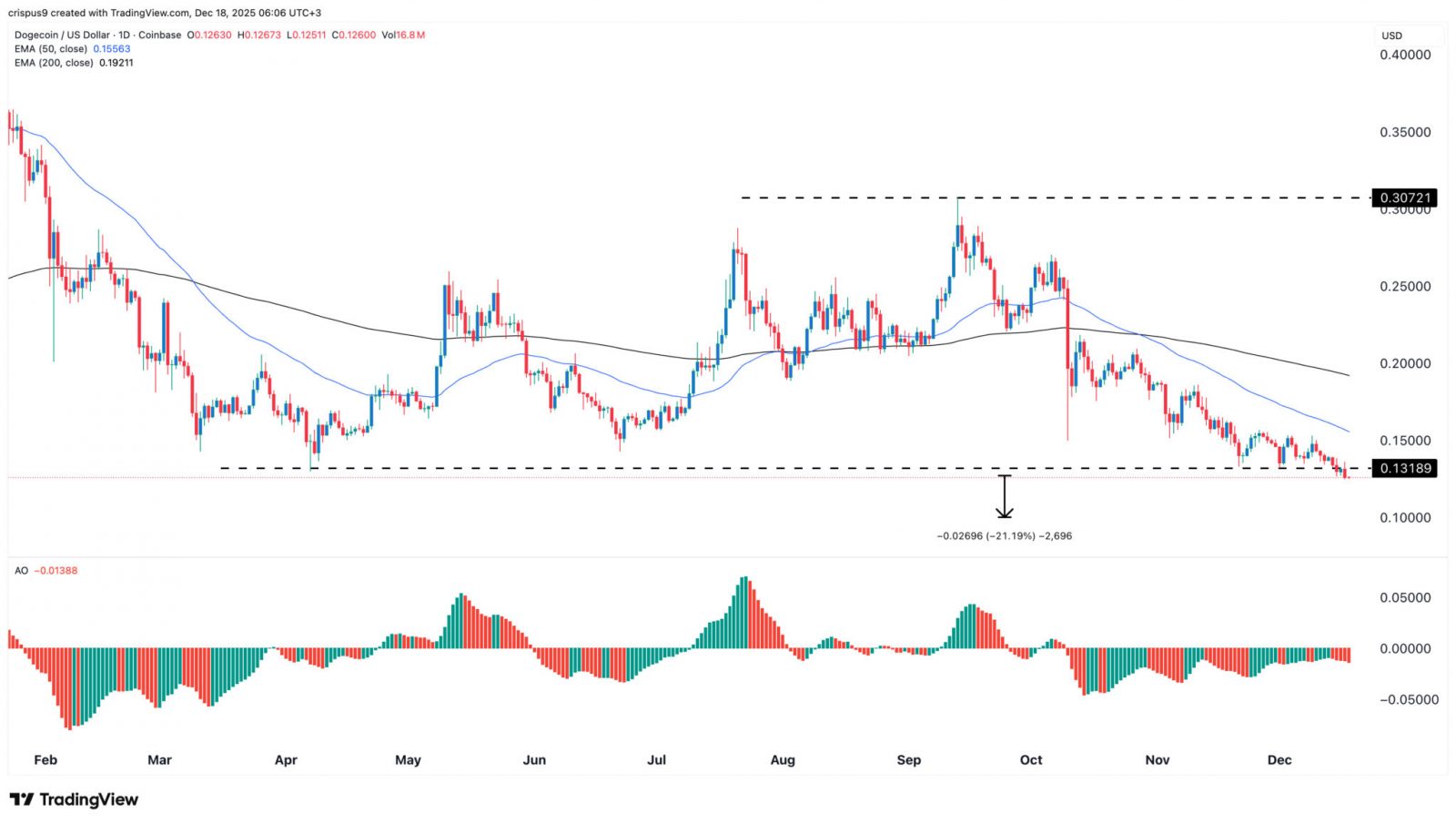 DOGE setzte seinen Abwärtstrend fort, da der Gegenwind auf dem Kryptomarkt zunahm und die Nachfrage nach seinen ETFs einbrach. Dogecoin wurde an einer wichtigen Unterstützungsmarke bei 0,1265 $ gehandelt und lag damit fast 60 % unter seinem Höchststand im September.