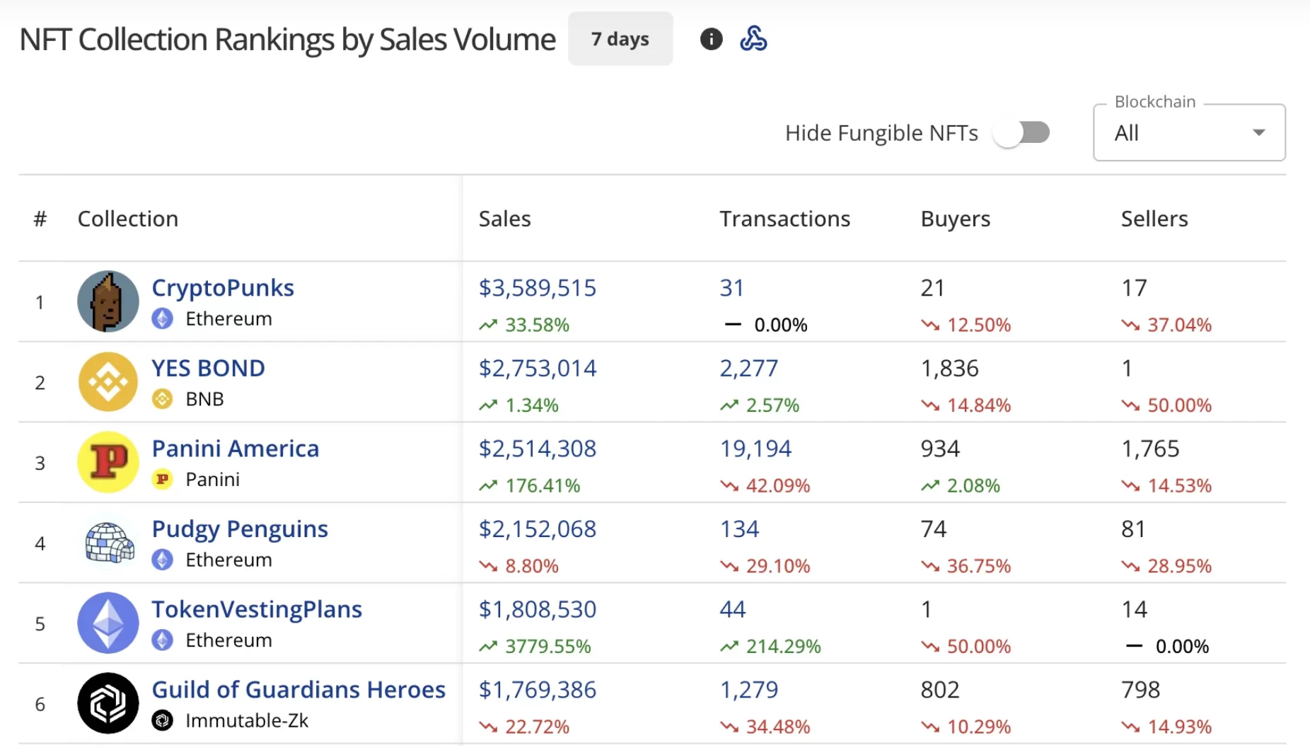 Un escenario notable emergió en las ventas de NFT referente a las colecciones. En Ethereum, CryptoPunks ascendió al liderazgo, aumentando las ventas semanales en más del 33%. Aunque el número de transacciones se mantuvo limitado, las ventas de alto valor demostraron el prestigio preservado de la colección. YES BOND en la red BNB aseguró el segundo lugar, mientras que la colección de Panini America en la blockchain Panini ascendió al tercero con un aumento superior al 170%.