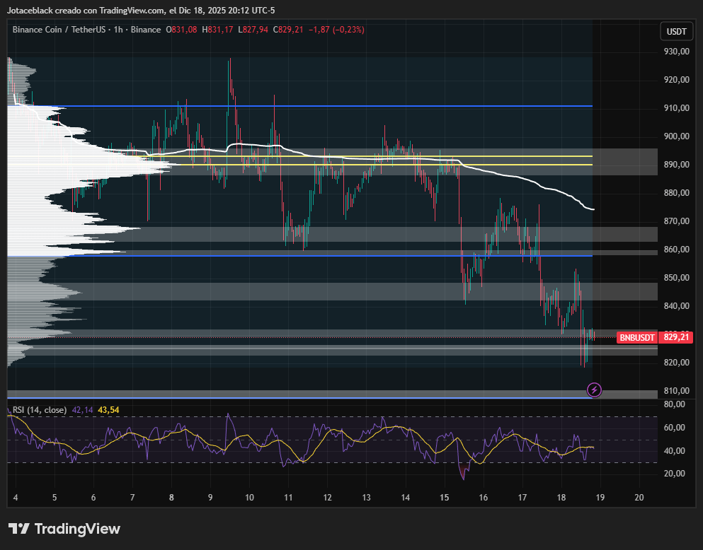 BNB registró una sesión de alta volatilidad, en la que el precio volvió a presionar niveles clave del corto plazo. Durante el día de hoy, el activo se negociaba en torno a los $835, antes de intentar un rebote técnico que lo llevó cerca de una resistencia clave en la zona de los $860.