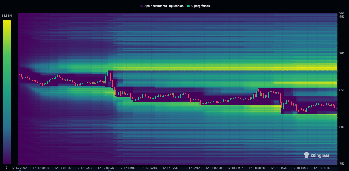 El mapa de liquidaciones de BNB refuerza la lectura técnica previa y aporta contexto sobre dónde se concentra el riesgo real. En el corto plazo, la mayor densidad de liquidez se sitúa por encima del precio actual, especialmente en el rango $860–895.