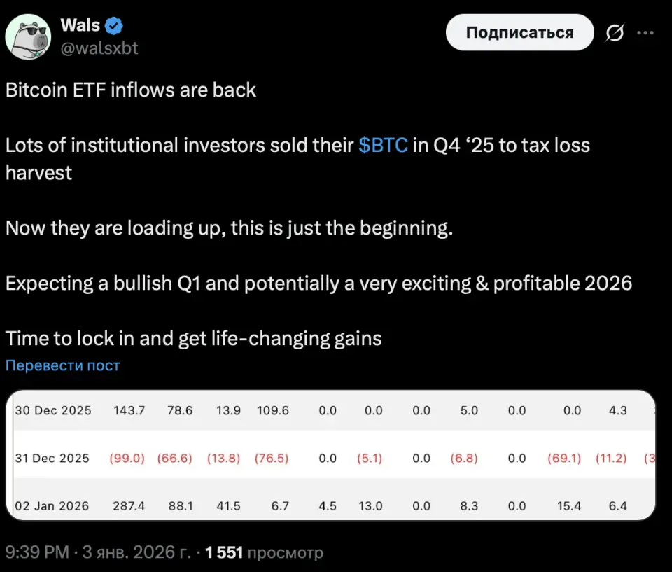 Главный маркетолог анализирующей крипторынок компании Tonso AI под псевдонимом Уолс (Wals) в соцсети X написал, что многие корпоративные инвесторы продавали BTC в четвертом квартале 2025 года с целью зафиксировать налоговые убытки. По словам Уолса, сейчас эти игроки возвращаются на рынок и активно наращивают позиции, а текущие события — лишь начало более масштабного тренда.
