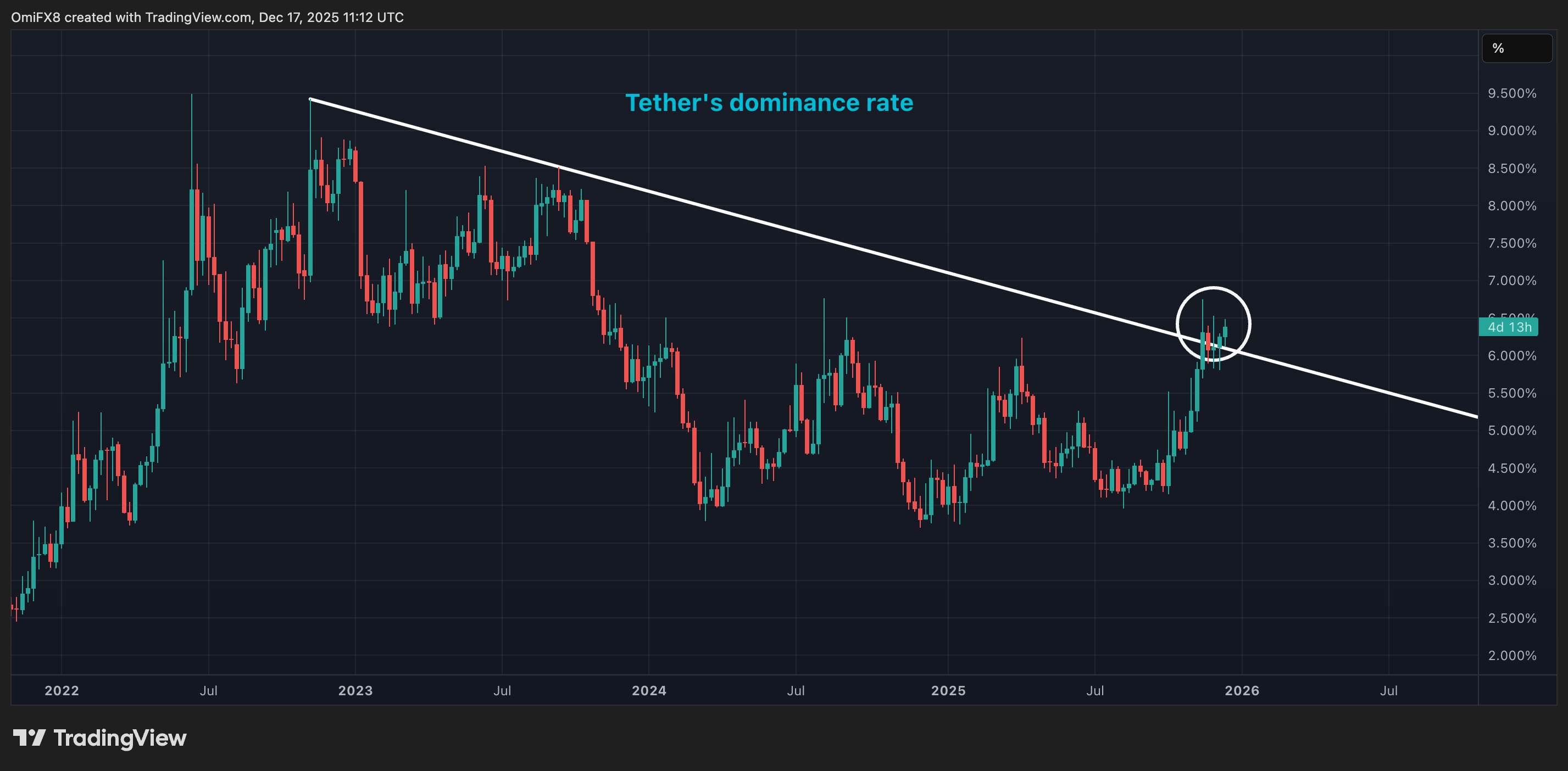 - The dominance rate has surpassed the three-year descending trendline, confirming a bullish breakout.