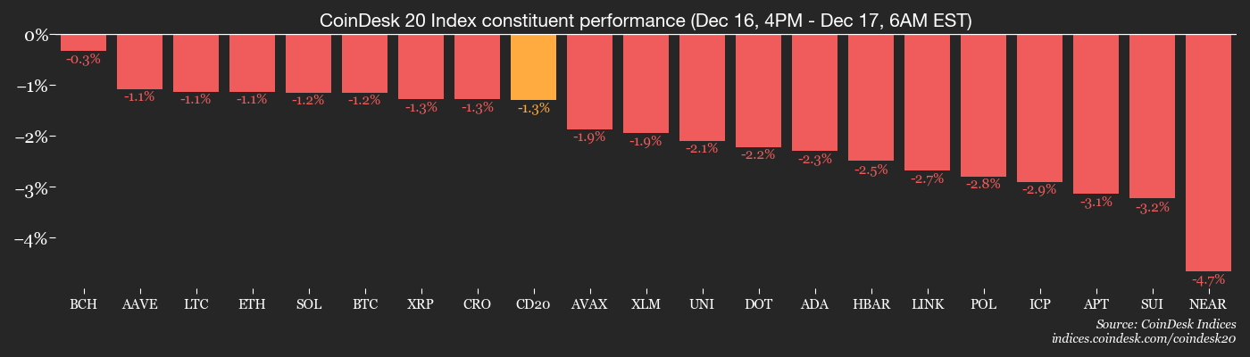 In the wider crypto market, there are some gainers like the Cardano-based NIGHT$0.06184 token, which has gained 9% in 24 hours. SKY and XMR have added 4% each, while the rest of the top 100 tokens are in the red. The CoinDesk 20 and CoinDesk 80 indices are both down over the period.