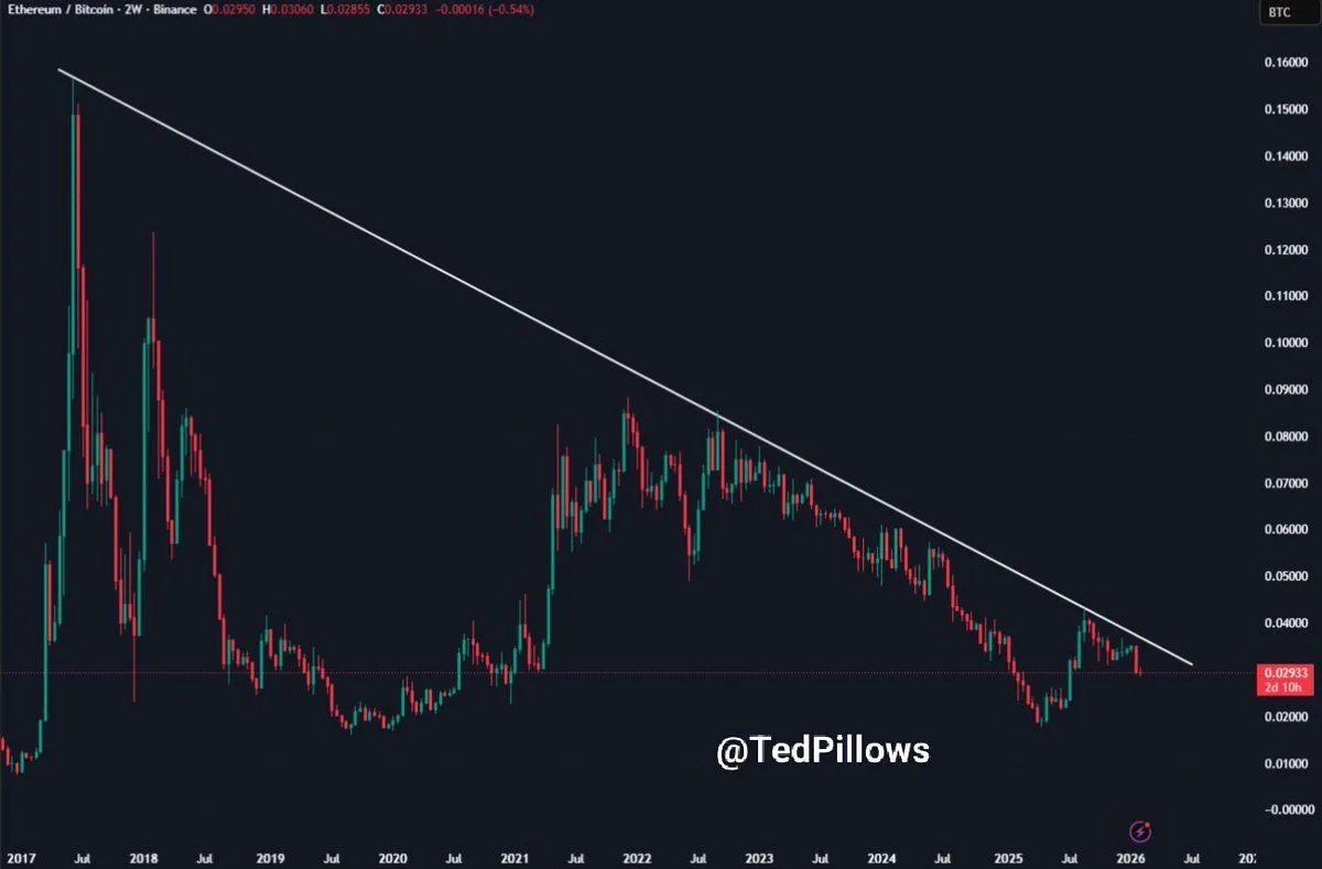 The $ETH/$BTC trading pair remained below a descending trendline that has capped rallies for nearly eight years, according to a biweekly chart from Binance shared by X user TedPillows. The chart labeled “Ethereum / Bitcoin – 2W (Binance)” shows a long series of lower highs from 2017 through early 2026, with each rebound failing near the same falling resistance line.