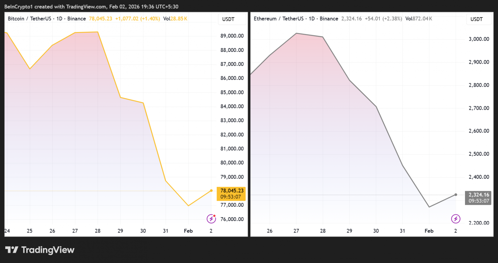 Динамика цен биткоина и Ethereum. Источник: TradingView