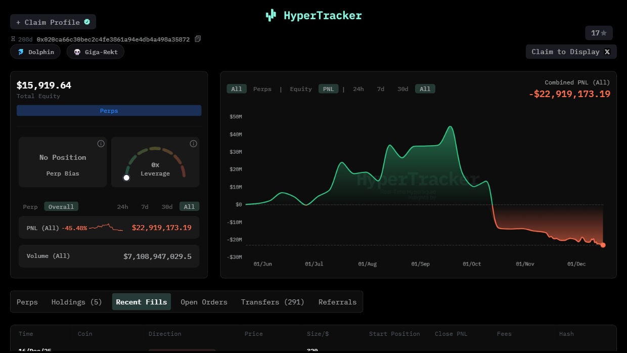 Desde la caída del mercado del 10 de octubre, la cuenta registró más de 200 liquidaciones, con pérdidas que superaron los 22.9 millones de dólares. En la última actualización, el saldo de la cuenta era 53.178 dólares.