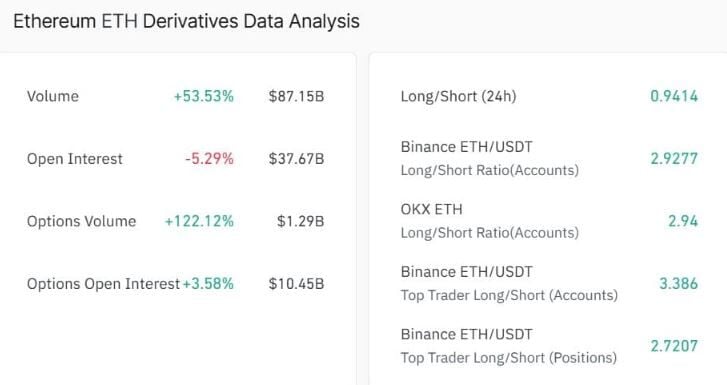 Con respecto al mercado de derivados, los datos de Coinglass compartidos por Ambcrypto ha señalado que el Volumen de Derivados aumentó un 53.5% hasta los 87.150 millones de dólares, mientras que el Interés Abierto cayó un 55.29% hasta los 37.670 millones de dólares.