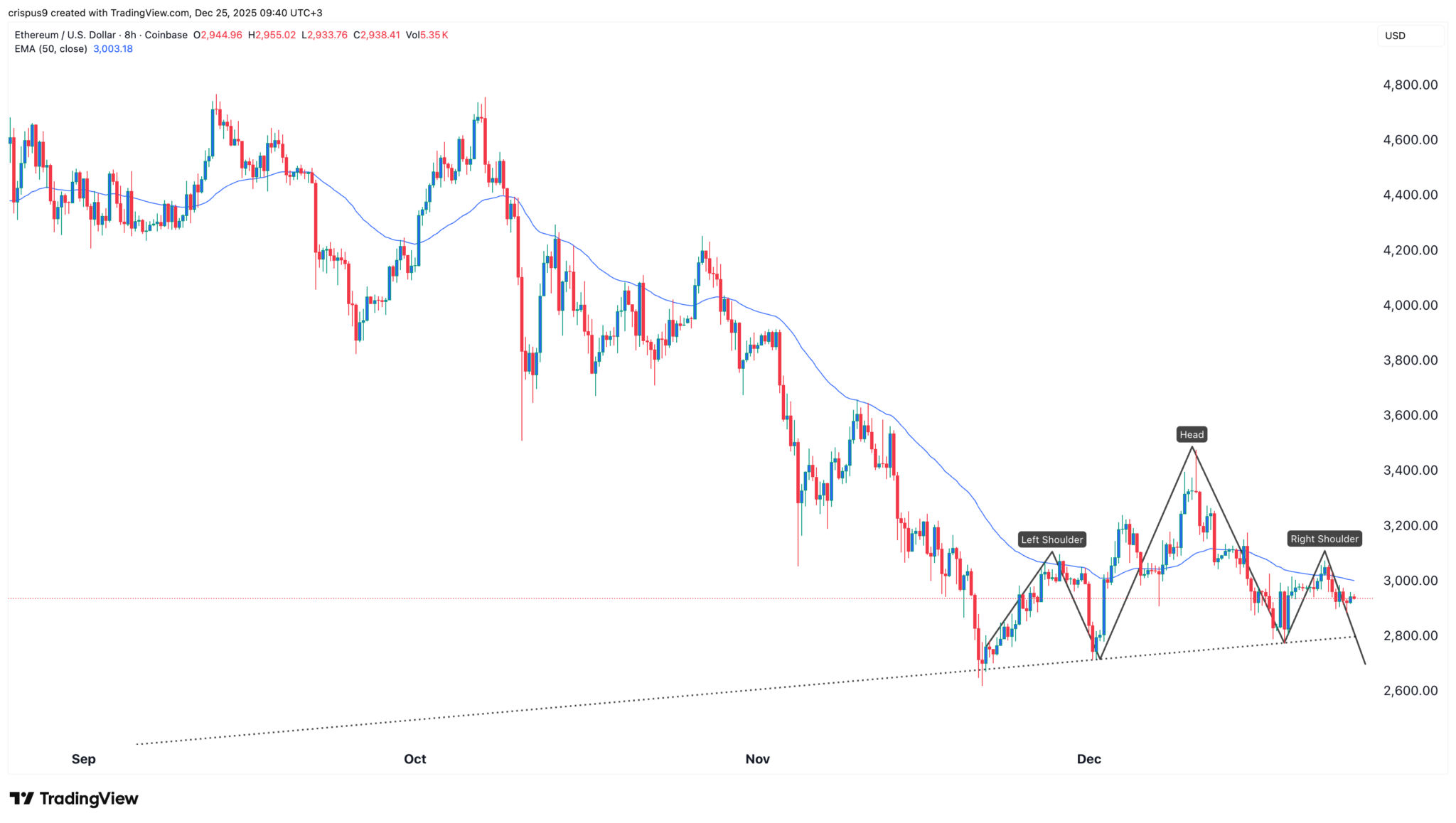 Auch der Acht-Stunden-Chart deutet auf einen weiteren Abwärtstrend hin. Wie im obigen Diagramm bleibt der ETH-Kurs unter allen gleitenden Durchschnitten. Am wichtigsten ist jedoch, dass er langsam ein Kopf-Schulter-Muster gebildet hat.