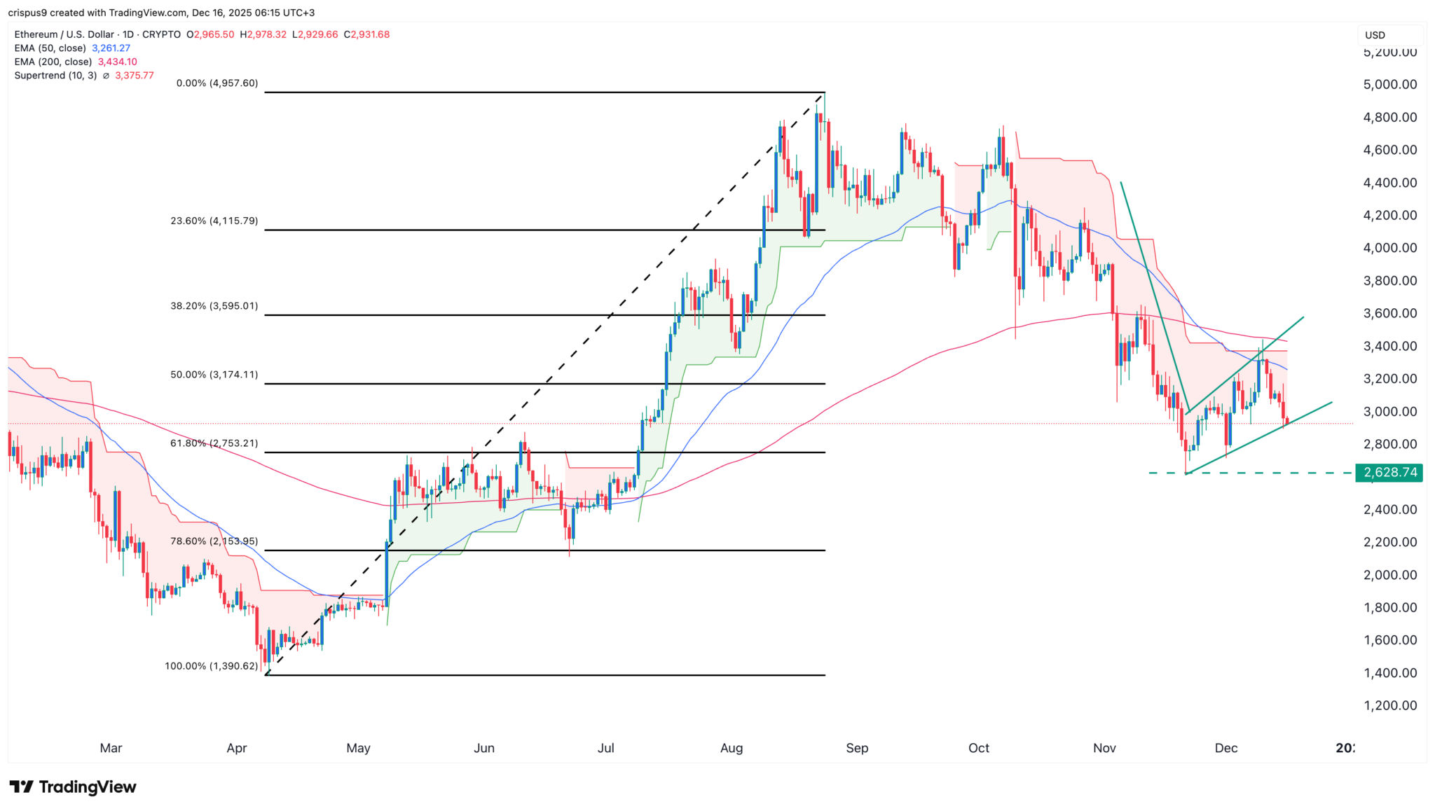 Das wahrscheinlichste Szenario ist daher, dass die Coin weiter fällt, während die Verkäufer die wichtige Unterstützung bei 2.628 $ anvisieren, dem Tiefststand im November. Ein Unterschreiten dieses Niveaus deutet auf eine weitere Abwärtsbewegung hin, möglicherweise bis zum psychologischen Punkt bei 2.000 $.