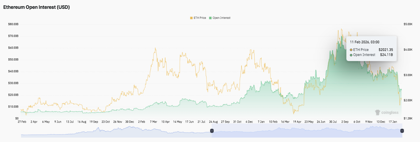 Ethereum open interest expanded aggressively through mid-year and peaked near $60 billion. That surge reflected rising leverage and strong speculative appetite. Significantly, recent data shows open interest contracting toward $24 billion. This unwind suggests liquidations, position trimming, and reduced leverage exposure.