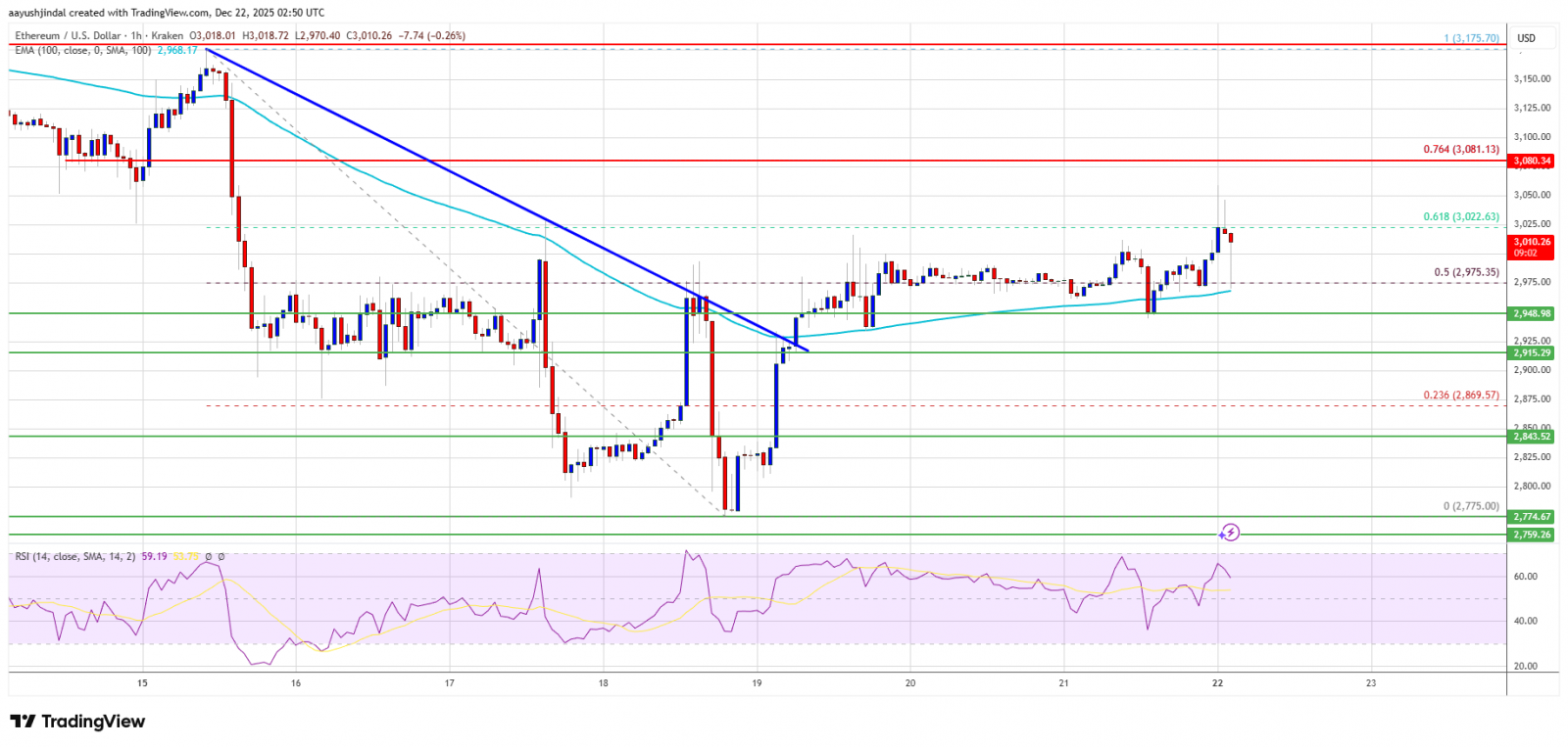 Ethereum price started a recovery wave above $2,950. ETH is now consolidating and might soon attempt another recovery wave if it clears $3,050.