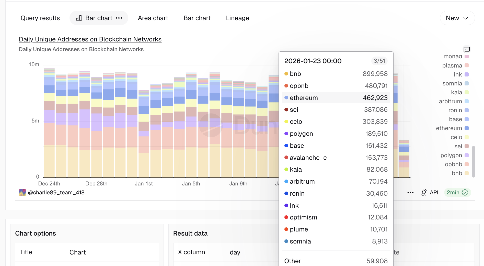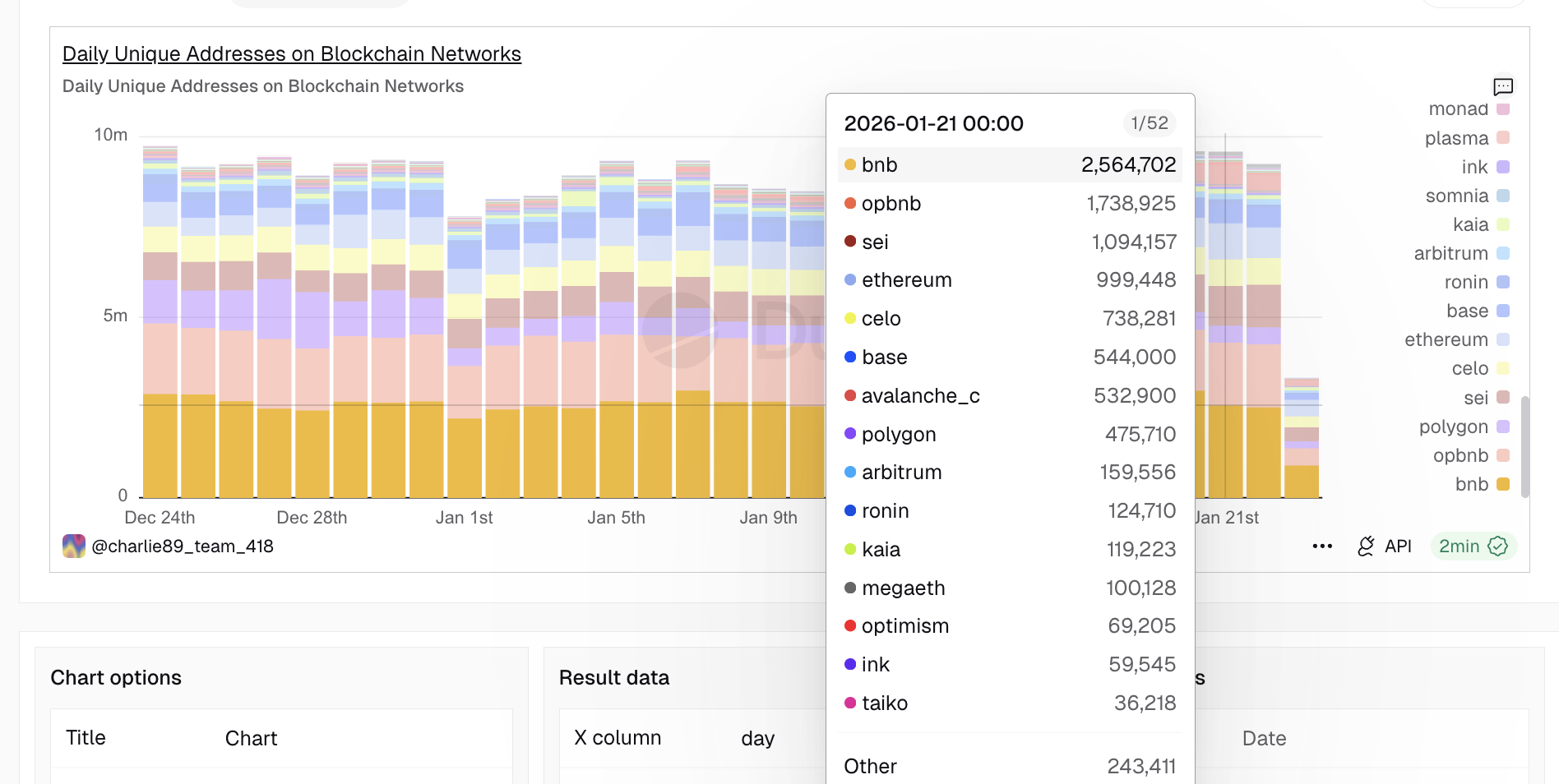 At press time on January 23, Ethereum has reclaimed the No. 2 spot in Layer-1 DUAs (daily unique addresses) behind BNB, as identified exclusively by BeInCrypto analysts. It just overtook SEI (another layer-1), which has seen strong activity recently due to gaming-related growth. opBNB (layer-2 for BNB), another frequent competitor, still remains higher.