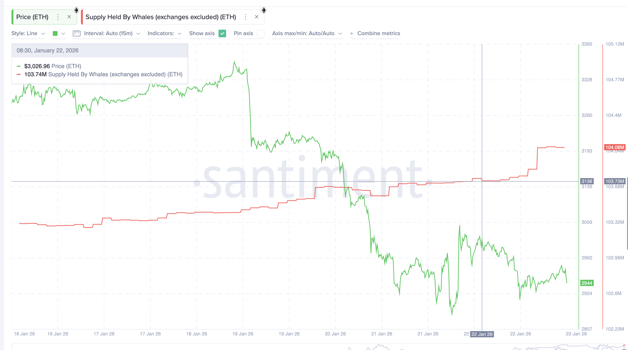 Over the past 24 hours, Ethereum supply held by whales (excluding exchanges) increased from 103.73 million ETH to 104.08 million ETH. That is an addition of roughly 350,000 ETH in a single day.