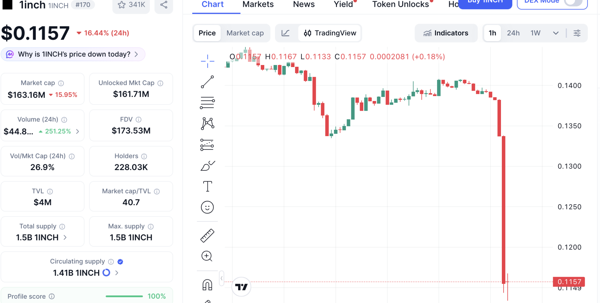 EmberCN также обратил внимание на низкий объем торгов 1INCH, особо отметив, что 24-часовой объем торгов парой 1INCH/USDT на Binance составил всего 1,5 миллиона долларов.
