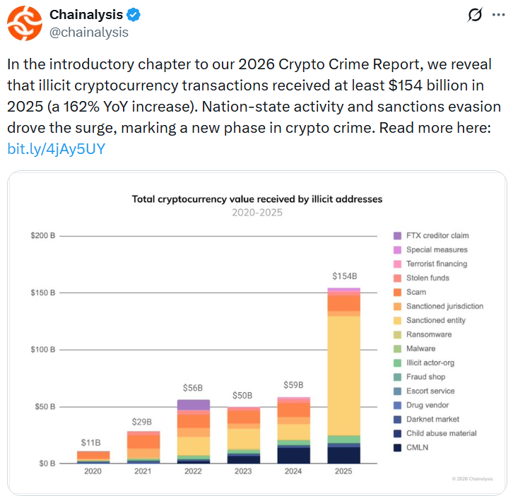 Illicit cryptocurrency addresses received at least $154 billion in 2025, a 162% increase year-over-year from 2024’s $59 billion, primarily driven by the value received by sanctioned entities.
