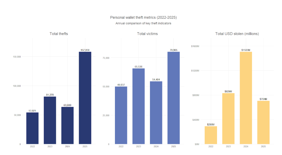 На другом конце спектра — обычные пользователи. Личные кошельки стали крайне популярной целью. Если в 2022 году на них приходилось лишь 7,3% от общей стоимости украденного, то в 2024 году этот показатель взлетел до 44%.