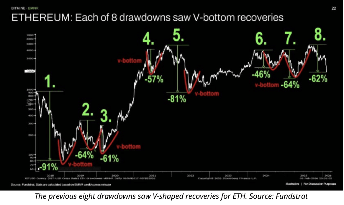 En el evento Consensus Hong Kong 2026 del miércoles, Tom Lee, cofundador y jefe de investigación de Fundstrat, instó a los asistentes a buscar oportunidades de compra en lugar de apresurarse a vender. Mencionó el trac de Ethereum , afirmando que la moneda ha experimentado ocho caídas independientes de más del 50% desde 2018.